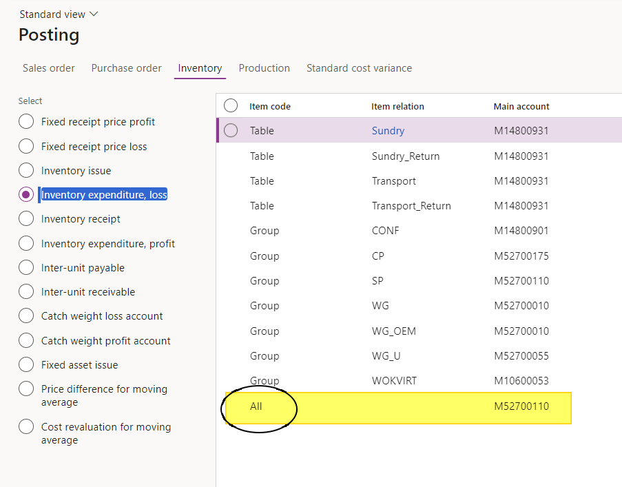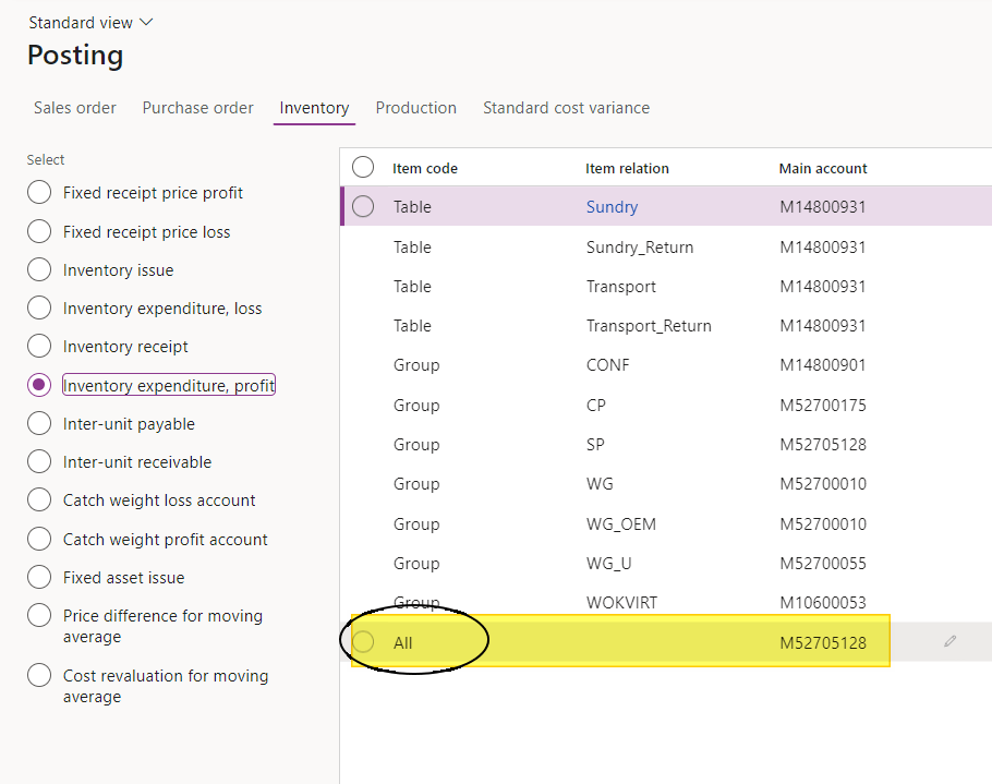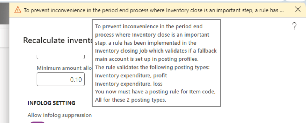 To prevent inconvenience in the period end process where Inventory close is an important step, a rule has been implemented in the Inventory closing job which validates if a fallback main account is set up in posting profiles. The rule validates the following posting types: Inventory expenditure, profit Inventory expenditure, loss You now must have a posting rule for Item code, All for these 2 posting types.