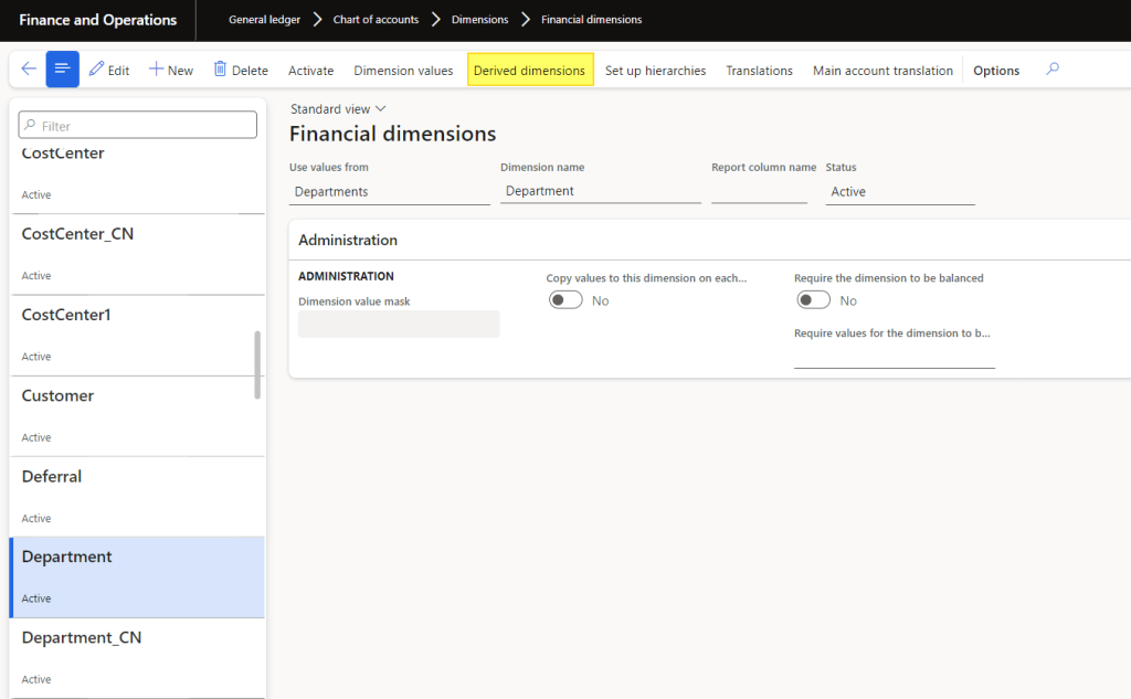 Select your input financial dimension and click on “derived dimensions”