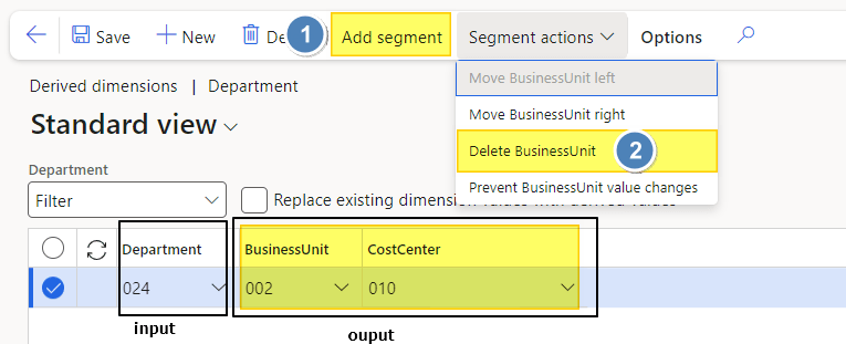 The first column is the input value (drive value), and the others are the output value (derived value). Press the “(1) add segment” button to add a new financial dimension as output. On the contrary, if you want to delete an output, select your column and press ” (2) delete”.