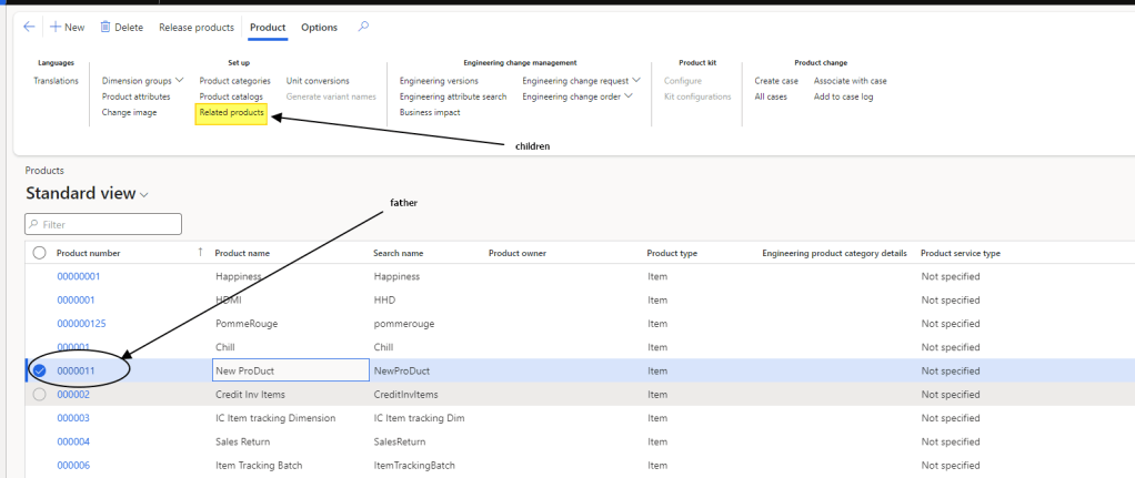 The relation is set on the product level. Select a product; this one will be the father of your relationship. Then press the button “Releted product” to inset the children’s product: