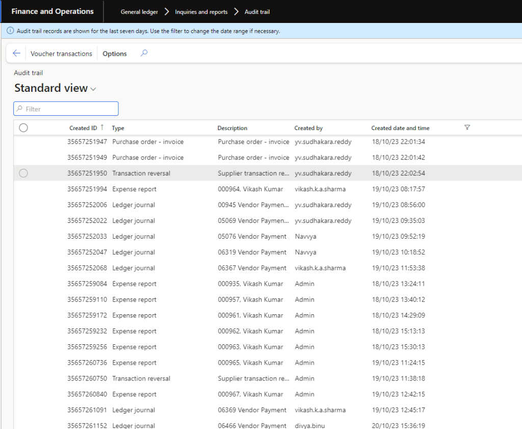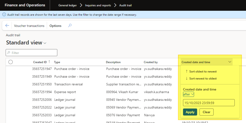 You can note that the form opens the transaction as default for the last 7 days. You can easily modify it by changing the filter in the field “created date and time”: