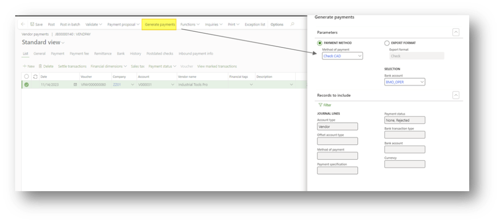Click in Generate Payments, select check the payment method and bank involved in the generation: