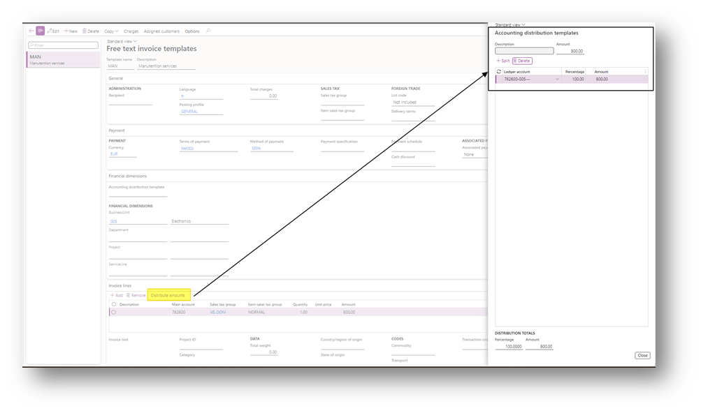 Concerning the template, we can also allocate the financial dimension on the line level using the functionality “Distribute amounts”: