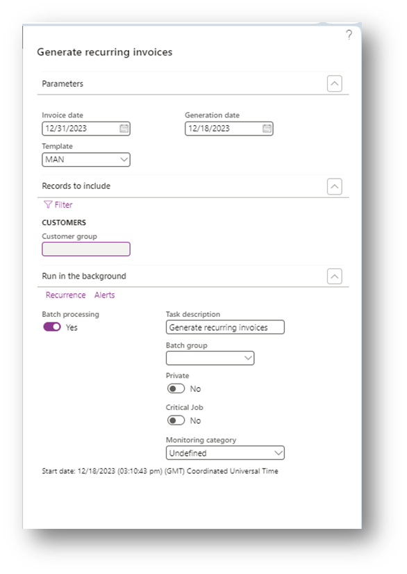 - Generation date: Date of calculation of recurring invoice;