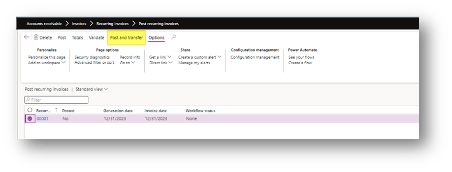 Go to: Accounts receivable> Invoices> Recurring invoices> Post recurring invoices. Select the invoice generated and go through the posting