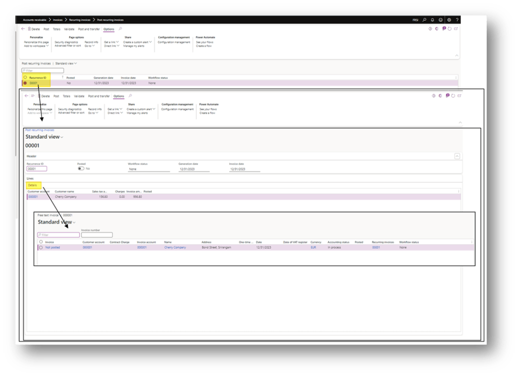 Before posting, you can review the document. By selecting Recurrence ID, the system displays an overview of all recurring free text invoices that have been created. Choose the relevant record and click Details to view additional information: