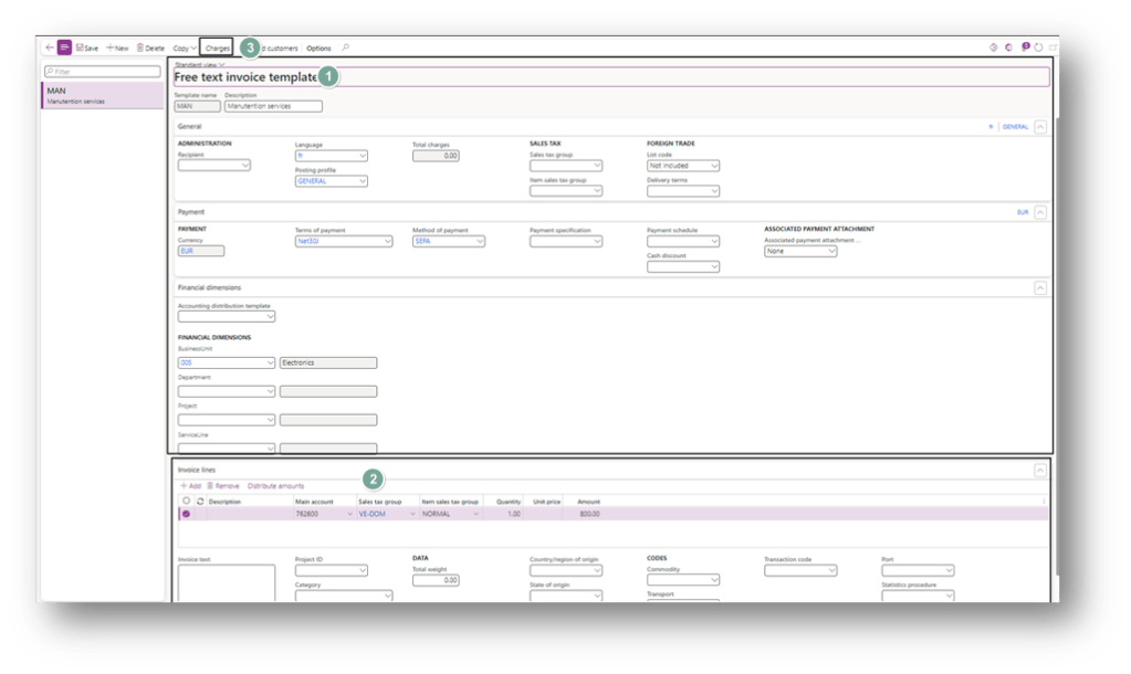 Go to: Accounts receivable> Invoices> Recurring invoices> Free text invoice templates. From here, you can create the template for our invoice. The data are pull in like a regular invoice on the header and line level:
