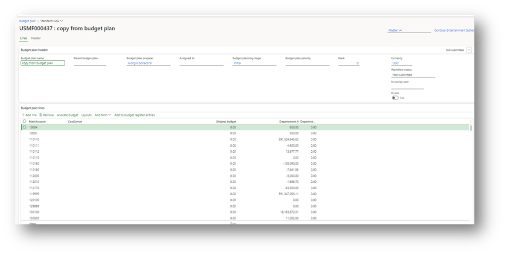 Launch the generation. When D365FO has finished, we can see the budget planning proposition: