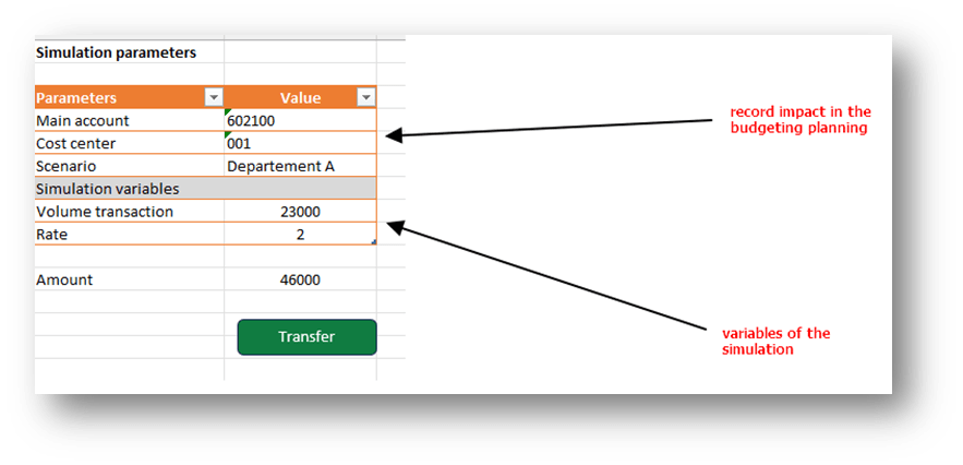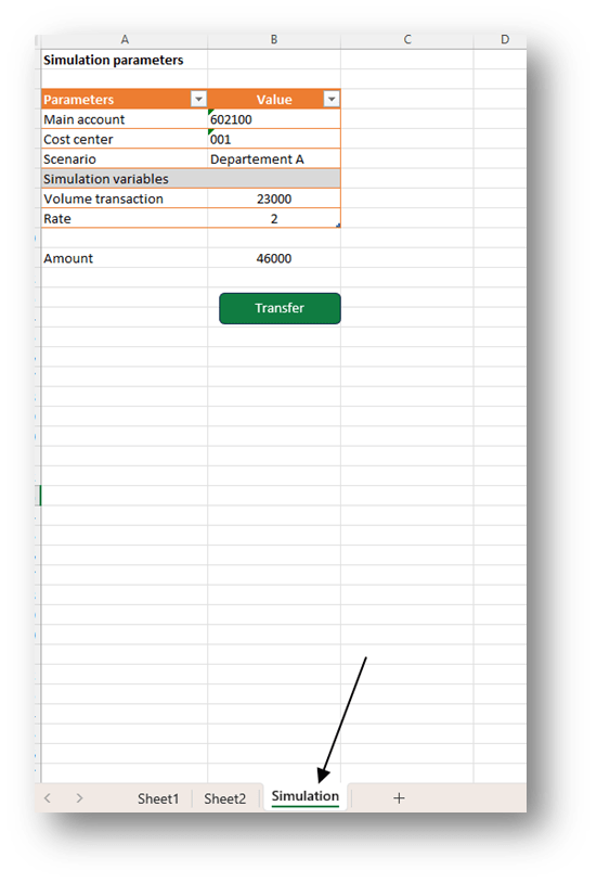 In a separate spreadsheet, we are going to change the variable of your simulation. This case is regarding a simple estimation of the revenue based on the multiplication of the sales volume and a rate. After the calculation, we can press the button “transfer” to transfer the simulation’s result in the budgeting planning: