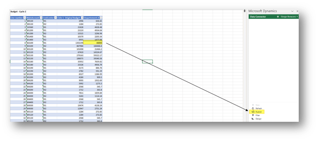 As you can see, the value is automatically transferred in the budgeting planning. Press publishes to transfer the new result in D365FO and complete the process: