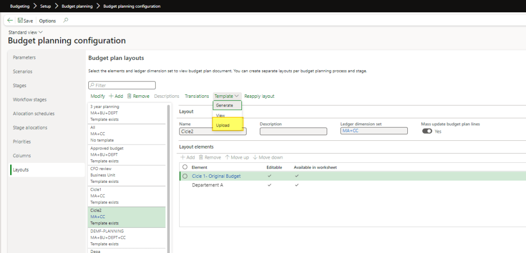 You need to create a dedicated Excel template linked your budgeting planning. The configuration in D365FO is the same that we follow for the regular Excel spreadsheet (remember not to launch the generation after the updating). The differences are: