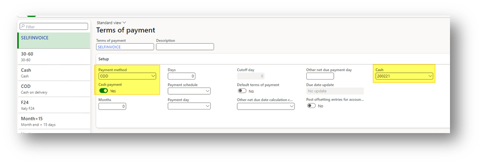 | 4 | Payment COD | Company | 122 | COD terms of payment | |