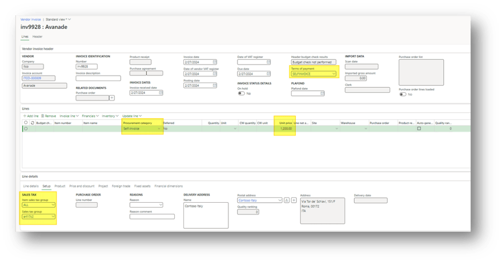 The vendor self-invoice is a document that the company uses to declare the VAT outgoing recognized during a purchase, but thar it’s not present on the vendor’s invoice. It happened, for example, in Europe when we purchased some extra-UE services (for example, for a D365FO implementation service from Avanade Canada). The original vendor invoice doesn’t contain the sales tax because it’s not a domestic vendor. However, legally we have the right to recognize an VAT outgoing from your transaction.