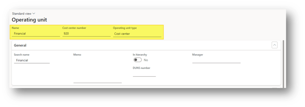 - financial dimension: the value of the financial dimension should be inherited from the operating unit configuration