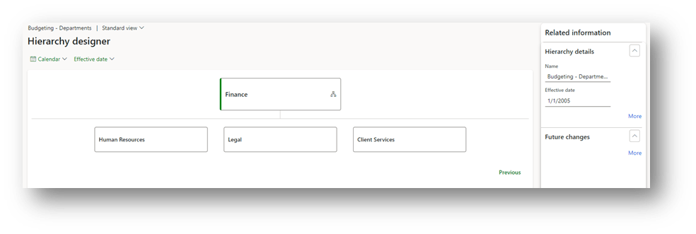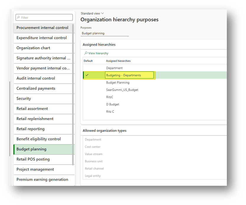 Select the purpose “Budget planning”. Here insert the organization hierarchy previously created: