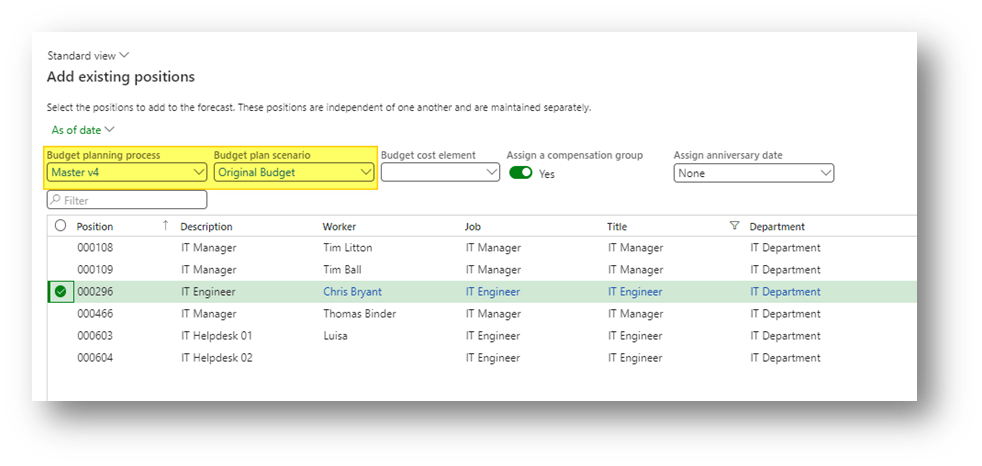 It’s necessary to add the position inside the budgeting planning process and scenario that we would like to consider: Click on “add existing position”, select the position, the budgeting planning process, the scenario concern and the budget cost element: