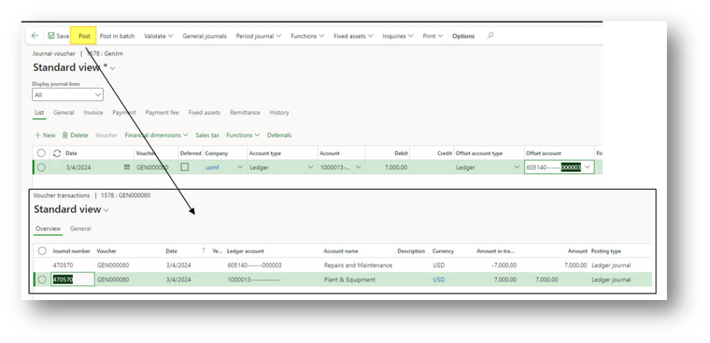 The capitalization can be run with a general journal entry or a fixed asset journal. Both solutions are the same; the differences are: