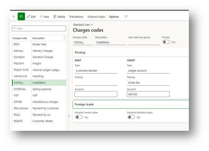 Create the charge code exactly as usual. In the example, we create an installation charge. We say: the customer is in “debit,” so we increased the value of our invoice, and as “offset” we set a revenue account:
