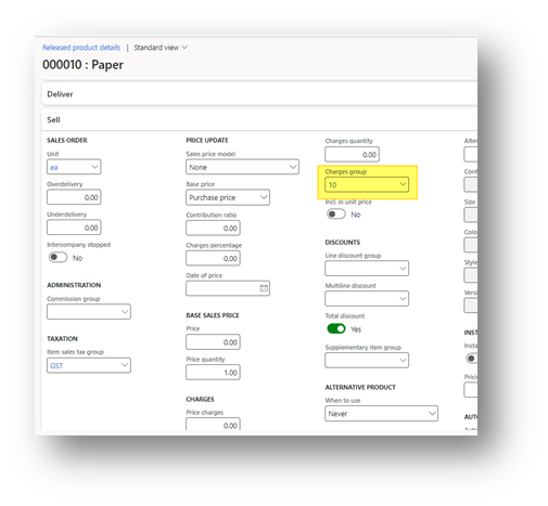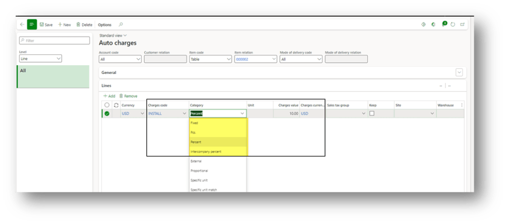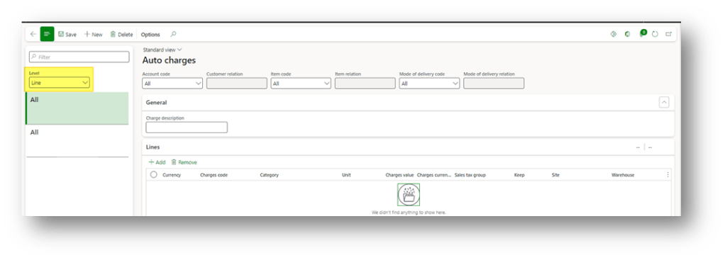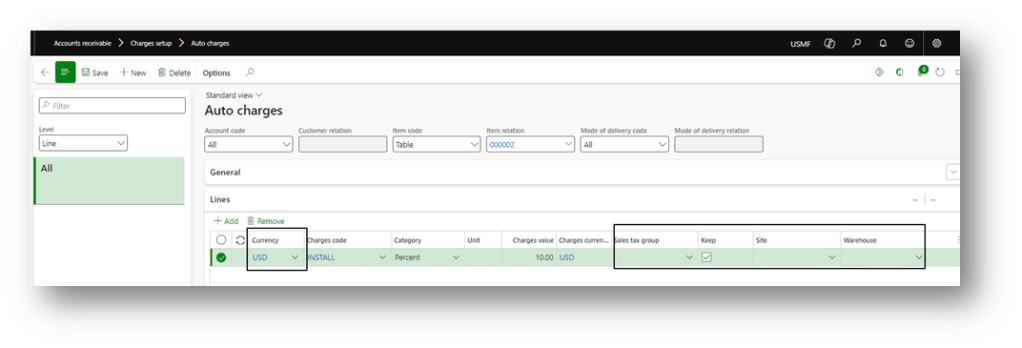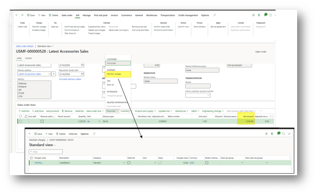 Create a sales order as usual. Here, if we jump into the charge header or line, we can find the charge automatically applied by D365FO: