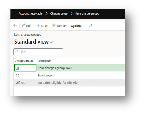 - Item charge groups: Go to Accounts receivable> Charges setup> Item charge groups