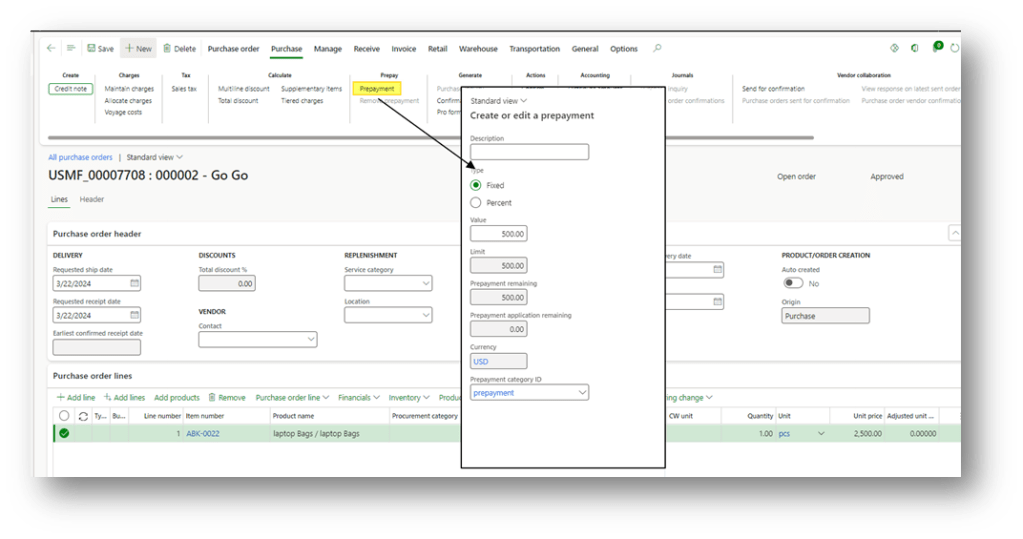 In the Prepayment dialog, the prepayment amount can be specified as a fixed amount or as a percentage of the total purchase order value.