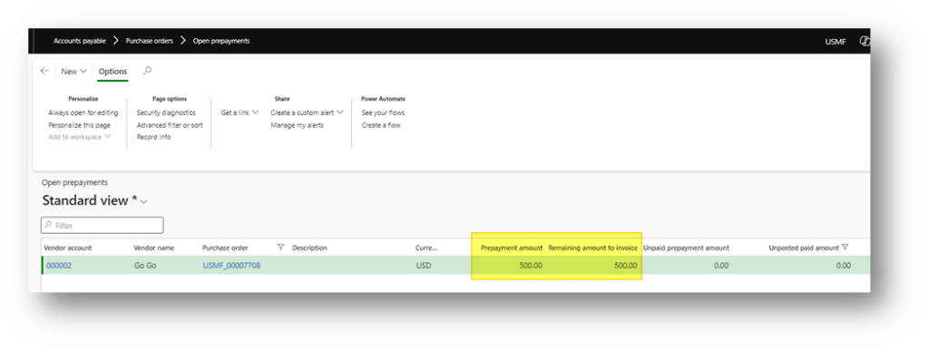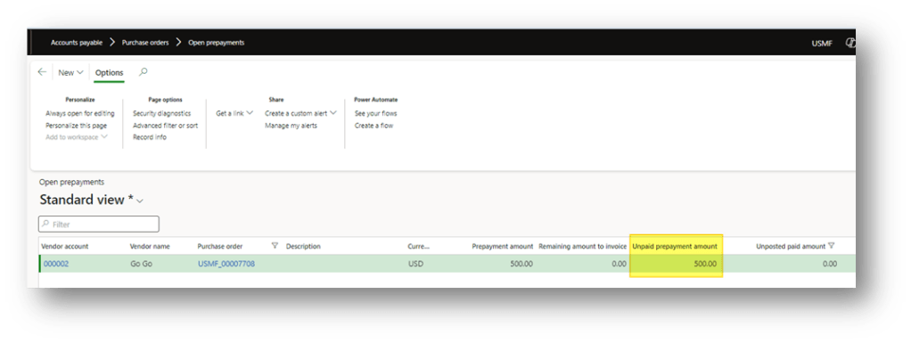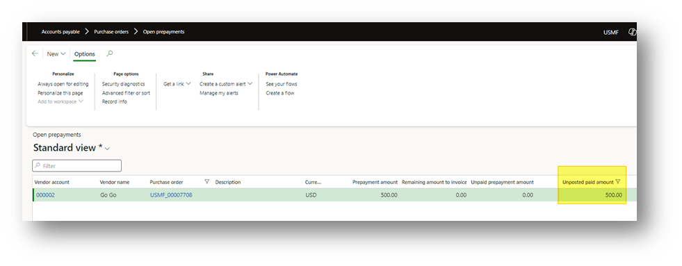 After posting the payment for the prepayment invoice, return to the Open prepayments form. You will see that the amount has moved to the Unposted paid amount field.