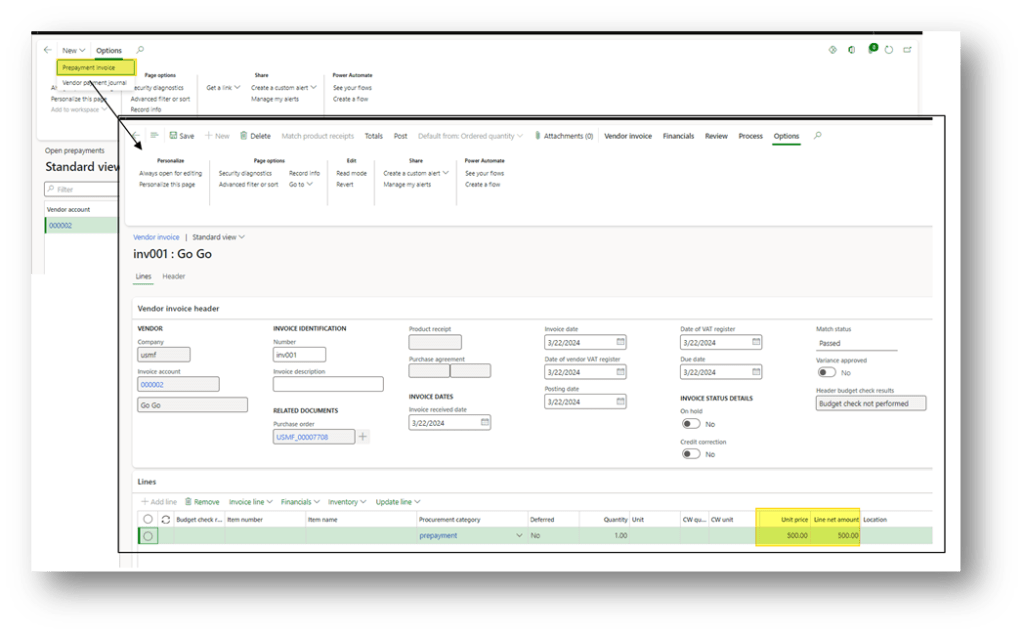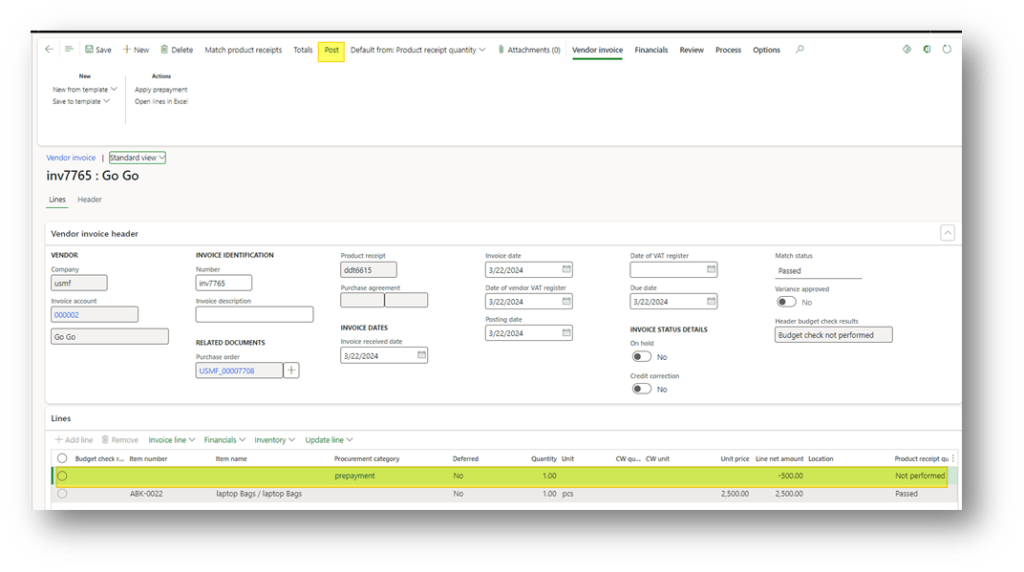 After applying the prepayment, D365FO automatically adds a negative line (using the prepayment procurement category) to the vendor invoice, reducing the net invoice total by the applied prepayment amount.