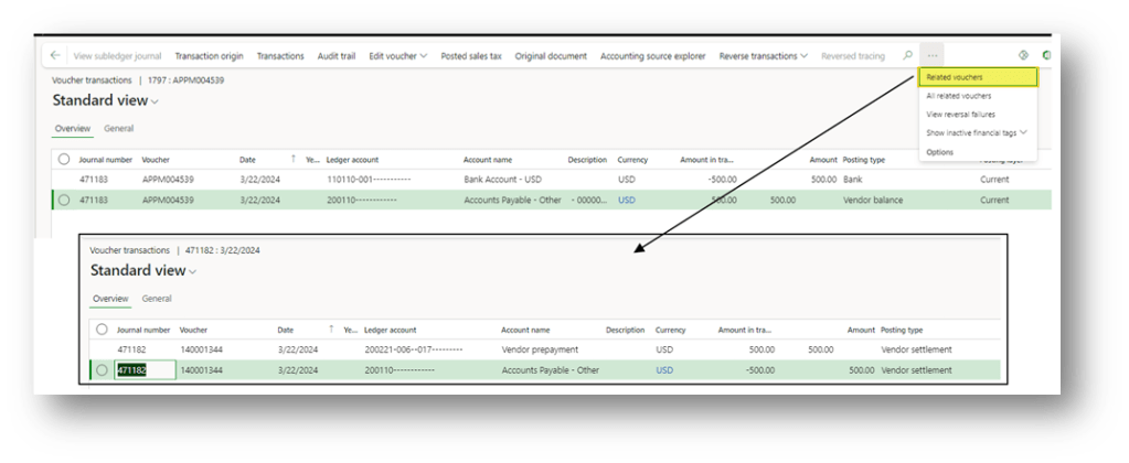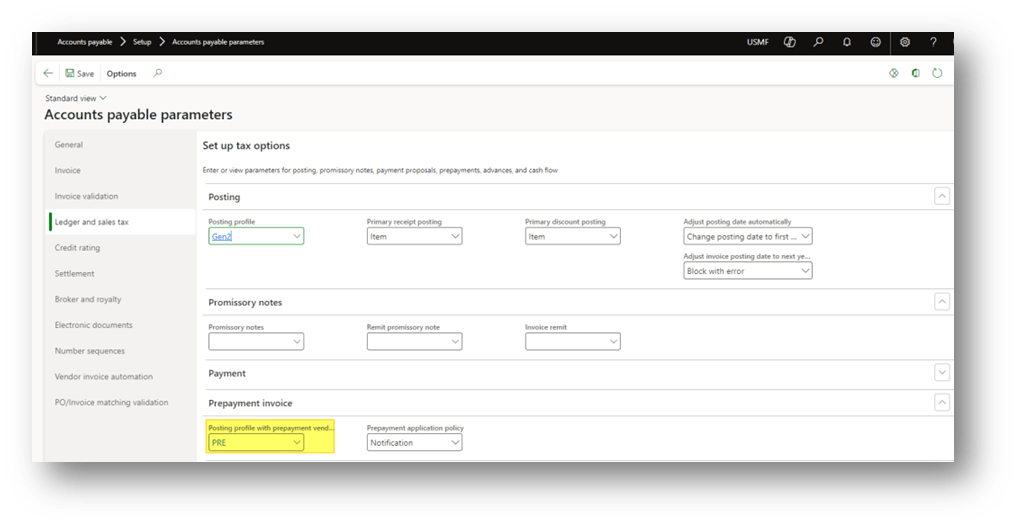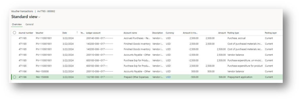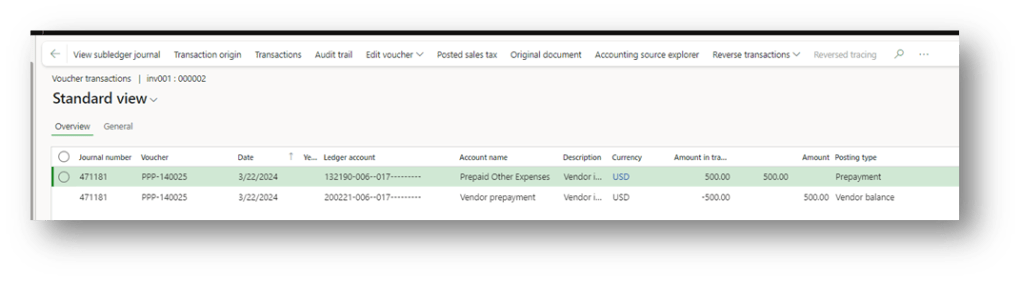 Note that when posting the prepayment invoice, D365FO automatically uses a dedicated posting profile (configured in Accounts payable parameters) to post the liability to the vendor’s summary account (Accounts payable) and the offsetting entry to a balance sheet prepayment asset account: