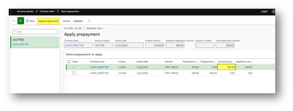 If needed, adjust the amount to apply (partial application is allowed), and the remaining prepaid amount can be used on another purchase order or invoice.