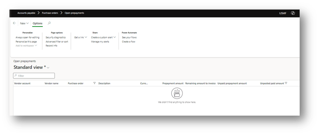 When we finish using the prepayment, we can see that the open prepayment amount disappears from the monitoring form: