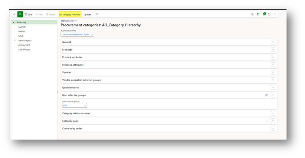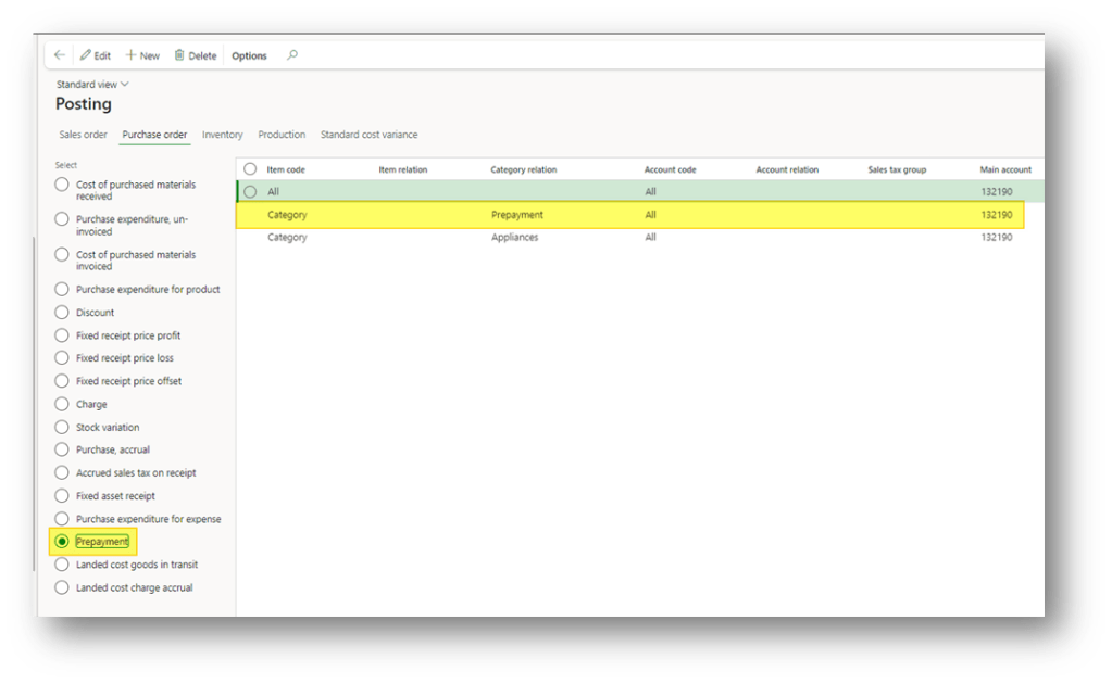 Click in “Edit category hierarchy” and create a new category dedicate of prepayment (follow these indications to insert the tax data: https://wordpress.com/post/daxmsdynamics365.wordpress.com/1512)