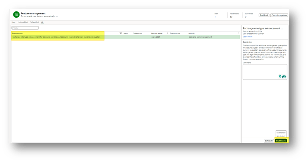 We need to enable the new feature “Exchange rate type enhancement for accounts payable and accounts receivable foreign currency revaluation”: