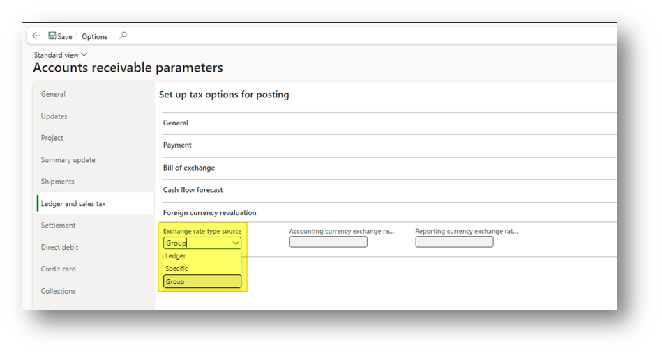 We leverage this setup, only if on the parameters we have decide to use as criteria “group”. Here, we can insert the exchange rate to use in the columns “Accounting currency exchange rate type” and “