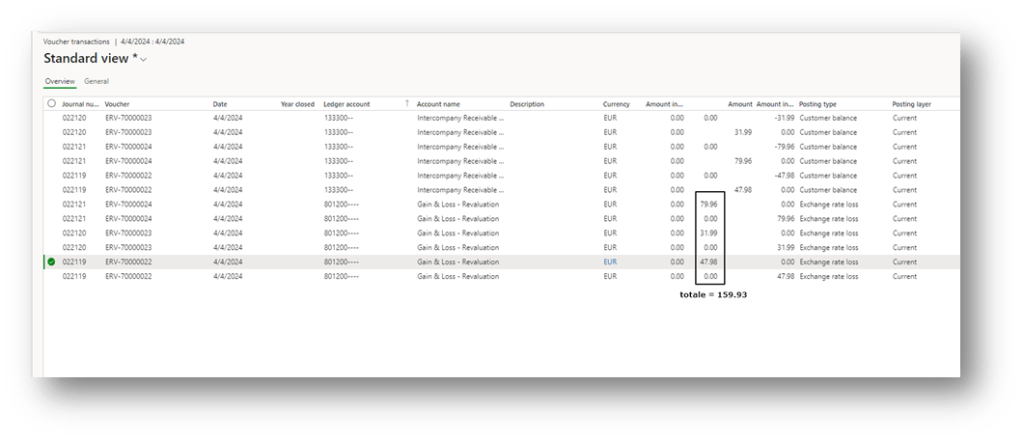 As expected, we obtained the posting based on the alternative posting profile. So, the total of the revaluation is a loss for 159.93 dollars: