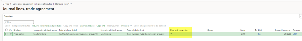 In some industry the trade agreements is fixed with a certain unit of measure, otherers the sales order can be insert with another one. For example, in the good we expose the price in kilogram to allow the user a more quicker comparison between the vendor prices. However, we don’t sell the product by kilogram but by bag. Therefore, we need that D365FO convert the sales unit price in kilogram to bag.