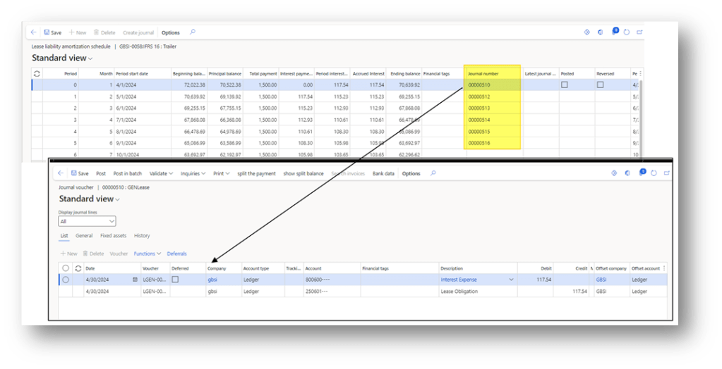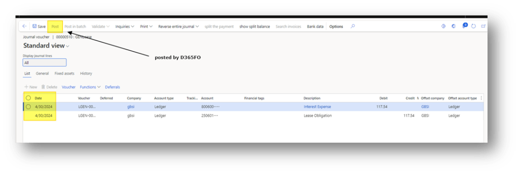 This is a financial lease. As we can see, the system automatically forecasts and generate the entry to do. So, we want to ask the system to proceed with the automatic monthly posting of those journals: