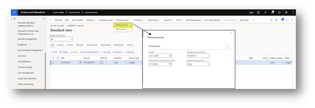Launch the function “retrieve the journal. Here we can indicate:
