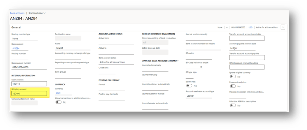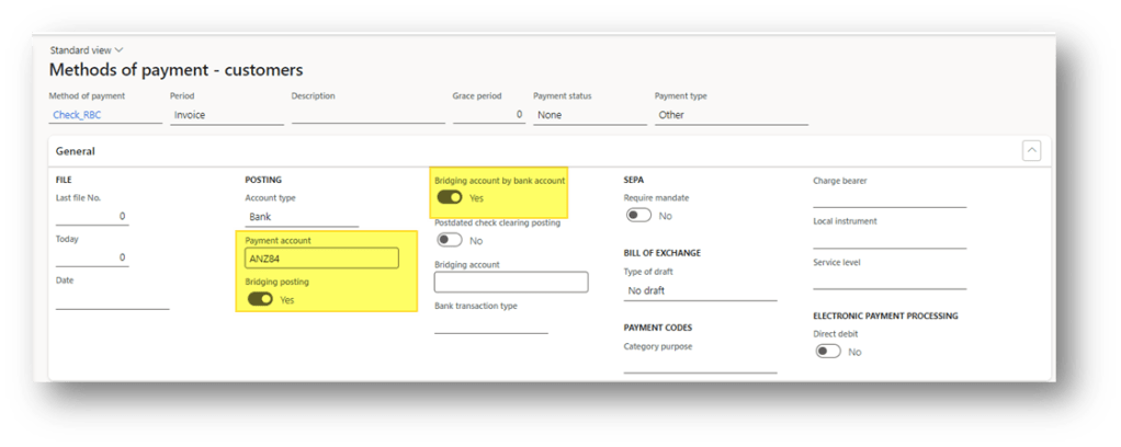 As usual, we select the flag “Bridging posting” to allow the bidging transaction. Furthermore, we have to also activate the flag “Birdging account by bank account” to use this feature, and add the bank account involved in it.