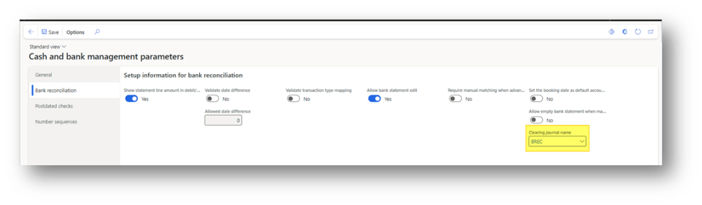 The system will automatically post the clearing of the bridging account when we mark the bank statement as reconciled. Indicate in the parameters the journal name that D365FO should use for this clearing: