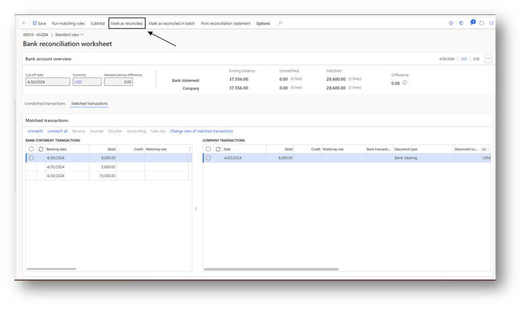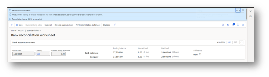 When we mark the statement as reconciled, the system automatically posts the clearing of the bridged account: