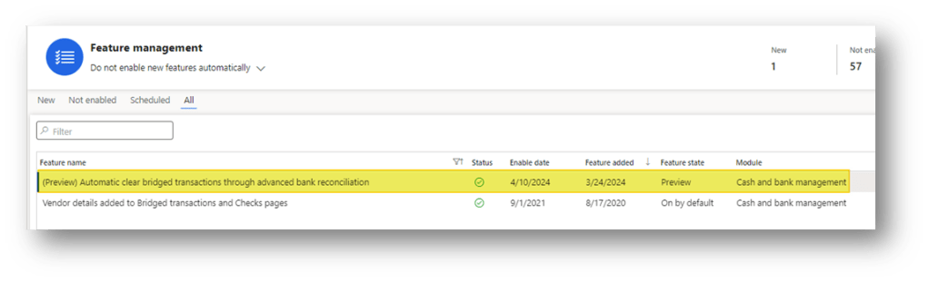 We need to enable the new feature “Automatic clear bridged transactions through advanced bank reconciliation”: