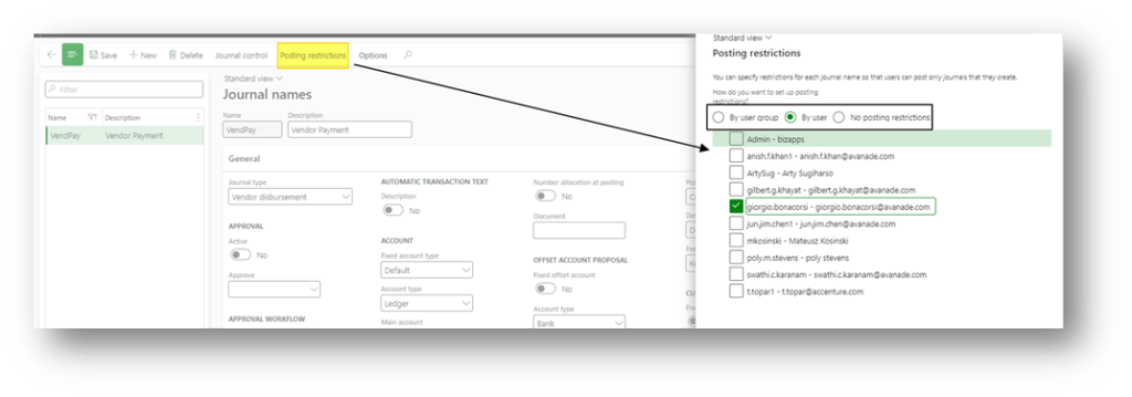 Posting restrictions are a validation that checks if the posting user is the same of the creation user. Don’t confuse this functionality with the approbation workflow because this one doesn’t work directly on the posting. The workflow’s responsibility is to authorize or deny the user’s proceeding with the posting. It does not care about who the poster is or if it’s different from the creator.