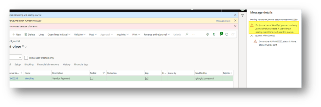 Go to our journal and try to post. If the user is present in the posting restriction, the system checks if she/he is the same who created the journal. If it isn’t, the system returns an error: