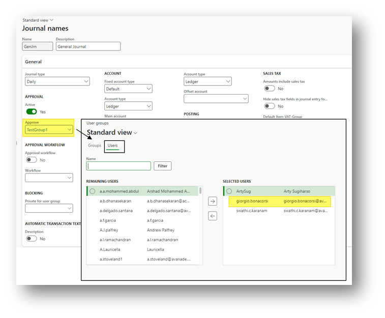 In the journal configuration, select the user group that will approve. In this group, we should have the user’s approver: