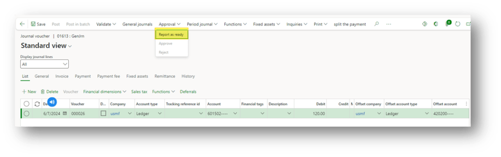 Create the journal as usual, and then we are ready to post; click on Approval>Report as ready. When we ask for approbation, the journal will freeze, so we cannot edit anymore: