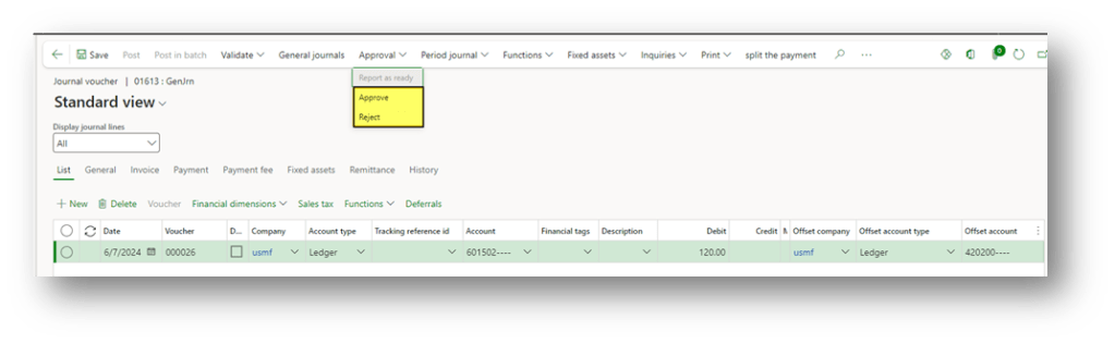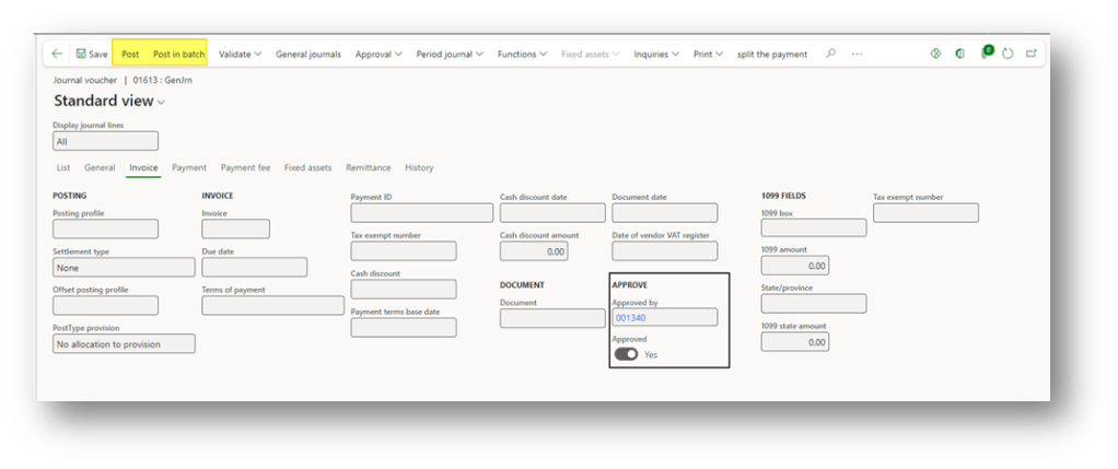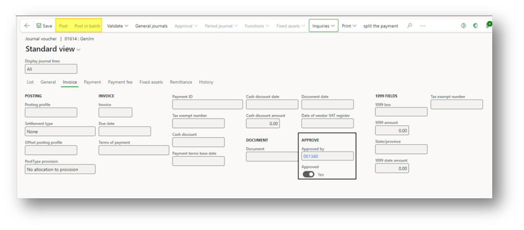 When the journal is approved, we can see that the field “approved” is turning on, and we have the name of the user who approved it. Therefore, it will be ready to post: