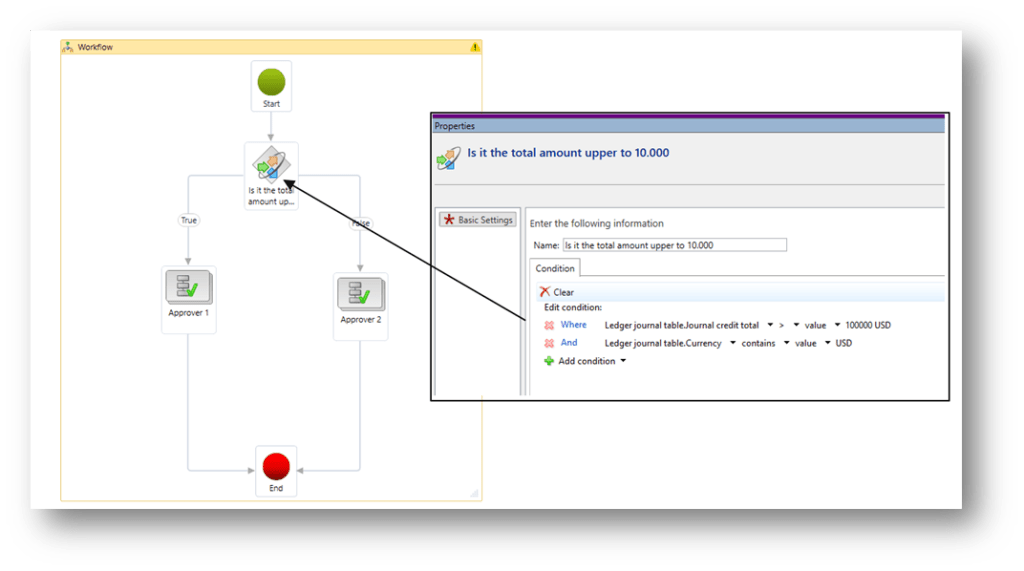 Here, we can find an example of workflow. In this case, if the total amount is up to 10.000$, we will ask for the approbation of approbator 1 and other approbator 2.