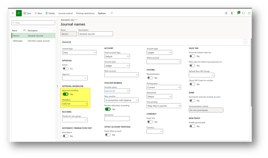 This configuration should be done in Microsoft Edge. Go to: General ledger> Journal setup> General ledger workflows.