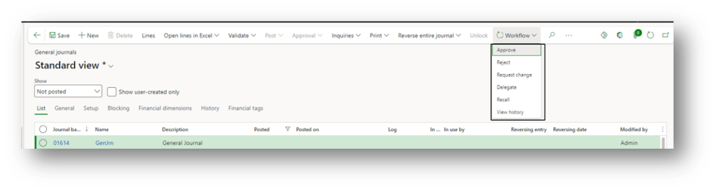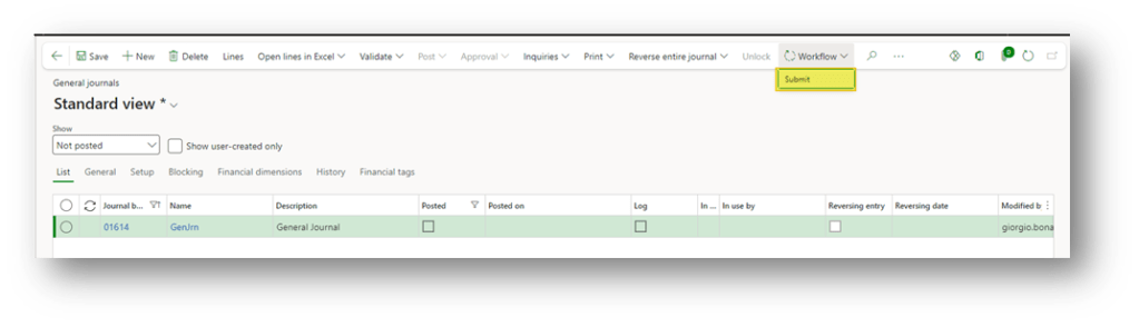 The workflow applied on the general ledger has a specific purpose: to authorize the posting of the journal. So, it’s the final step before the posting, where we will ask the approbator if to approve or not the journal.