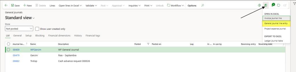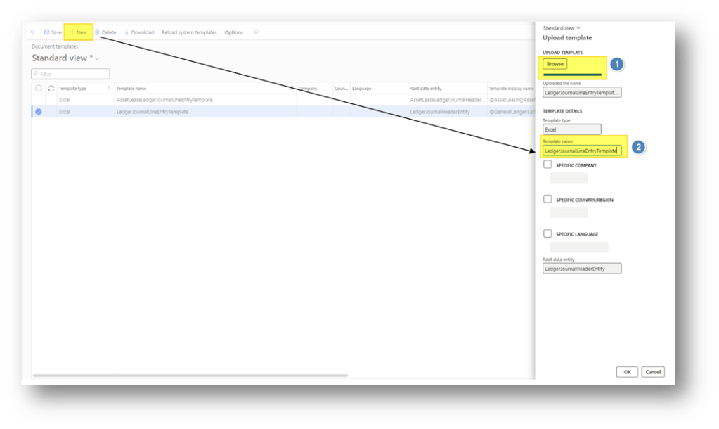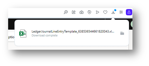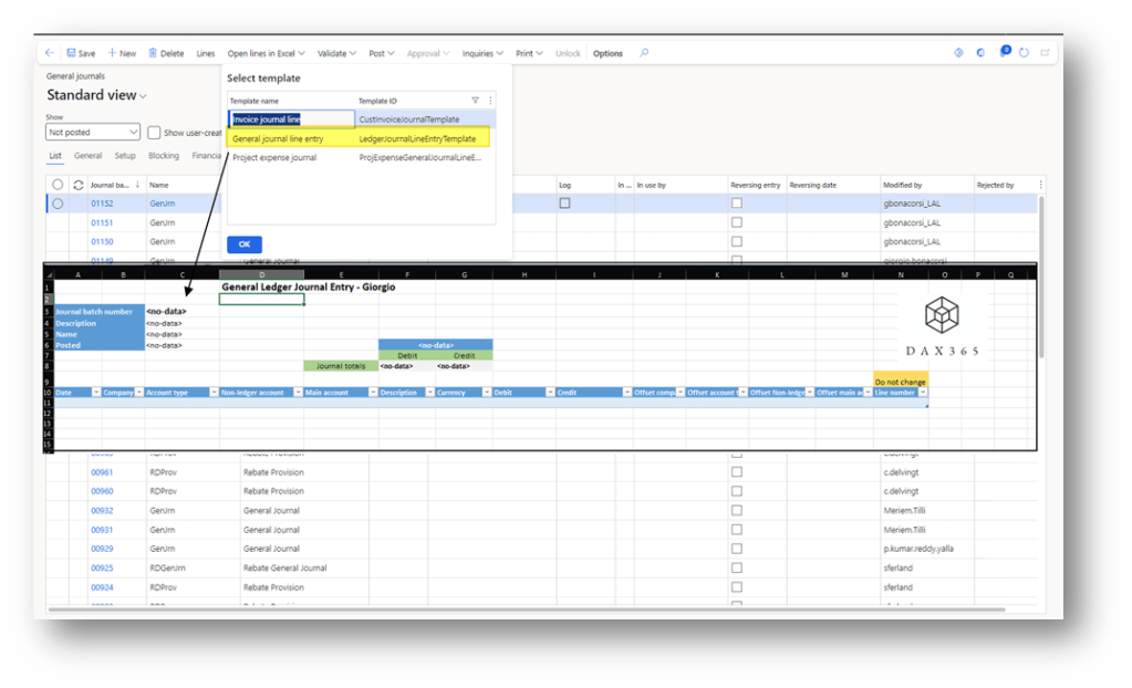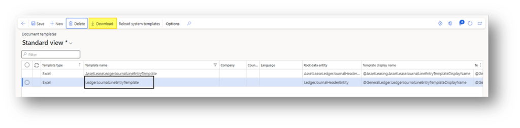 Select the appropriate template based on its name. In this case, choose the template named “LedgerJournalLineEntryTemplate” and download it.